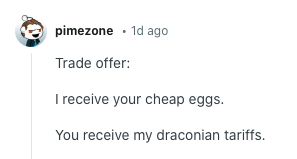 “特朗普一邊打關稅戰(zhàn),一邊討要雞蛋。要不把關稅戰(zhàn)停下,我們再談雞蛋?”