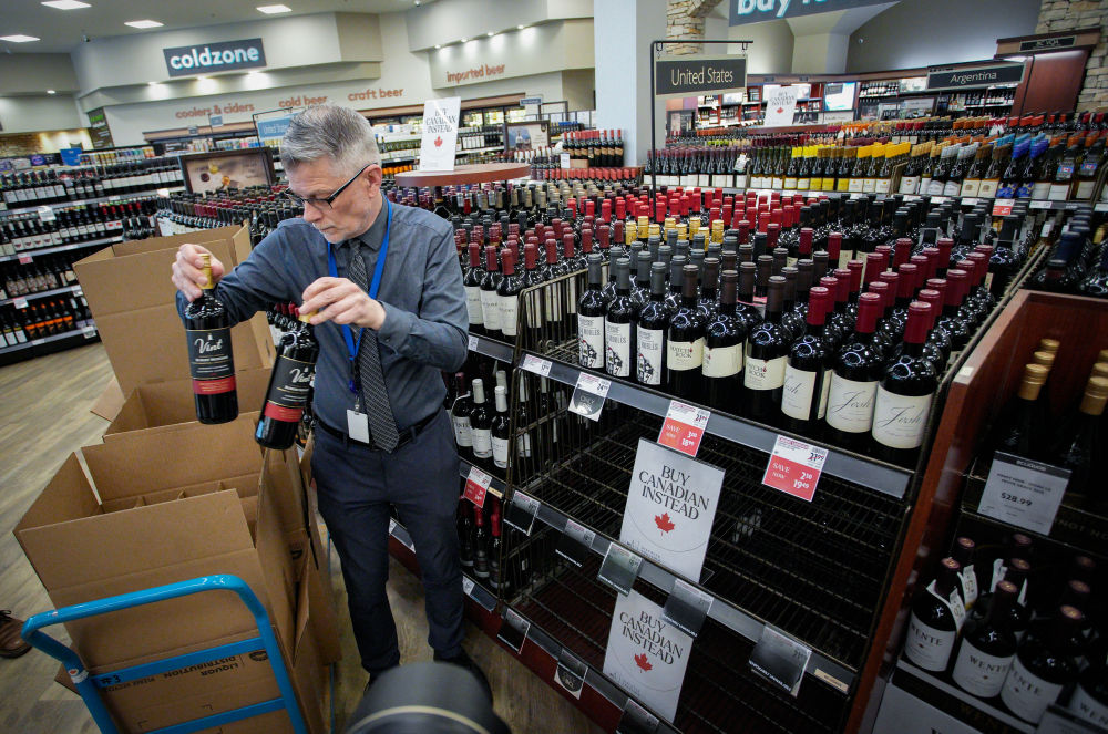 3月10日,在加拿大溫哥華,一家不列顛哥倫比亞省酒類專賣店的店員從貨架上撤下美國酒類產(chǎn)品。新華社發(fā)(梁森攝)