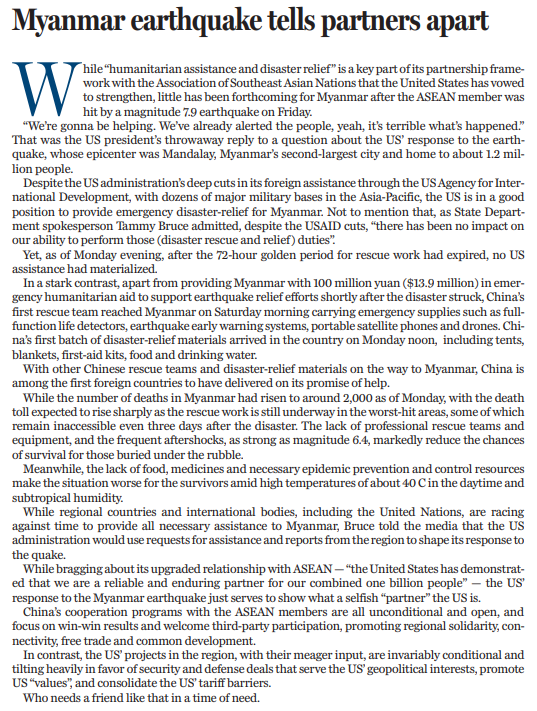 “人道主義援助和救災(zāi)”是美國(guó)與東盟伙伴關(guān)系的重要內(nèi)容,美國(guó)也信誓旦旦地宣稱要加強(qiáng)救援合作,但截至3月31日下午,緬甸地震72小時(shí)救援黃金時(shí)間已經(jīng)過去,緬甸當(dāng)?shù)厝晕闯霈F(xiàn)美國(guó)救援隊(duì)的身影。
