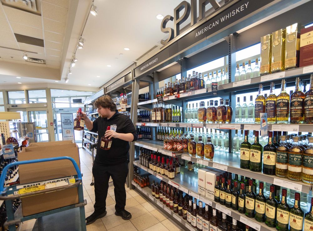 2025年3月4日,在加拿大安大略省的奧克維爾,一酒商門店的店員從貨架上撤下美國品牌酒產(chǎn)品。新華社發(fā)(鄒崢攝)