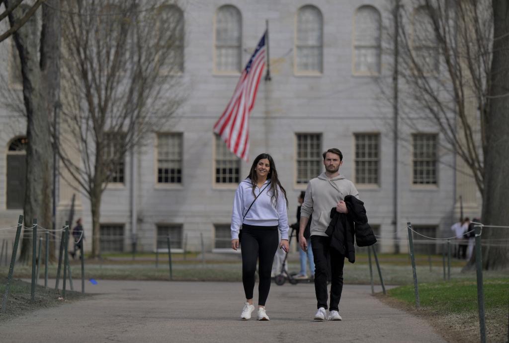 4月15日,人們漫步在美國(guó)馬薩諸塞州劍橋市的哈佛大學(xué)校園內(nèi)。新華社/路透