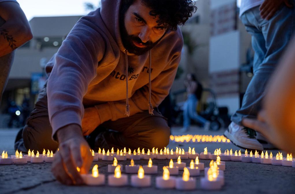 2024年10月7日,新一輪巴以沖突爆發(fā)一周年之際,在美國(guó)加利福尼亞州洛杉磯,加利福尼亞大學(xué)洛杉磯分校的學(xué)生們參加集會(huì)活動(dòng)時(shí)點(diǎn)亮蠟燭。新華社/美聯(lián)