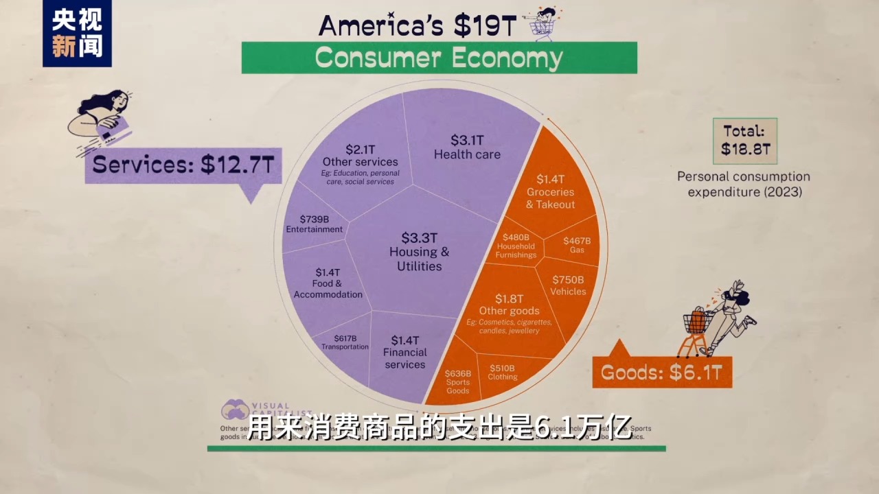按美國勞動局?jǐn)?shù)據(jù),美國人2023年消費(fèi)支出18.8萬億美元,其中12.7萬億花在了看病、租房、交學(xué)費(fèi)、打官司等服務(wù)上,用來消費(fèi)商品的支出是6.1萬億,不到總消費(fèi)的三分之一。所以吹噓美國消費(fèi)能力強(qiáng)屬實(shí)是個(gè)“地獄笑話”,看病花錢多有什么可驕傲的?