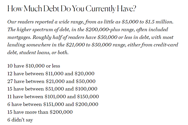 該網(wǎng)站針對102名讀者就個人債務(wù)問題進行了調(diào)查,了解他們?nèi)绾伪池摵蛢斶€債務(wù)。調(diào)查發(fā)現(xiàn),個人債務(wù)總額從5000美元到150萬美元不等,20萬美元以上的債務(wù)通常包含抵押貸款。約半數(shù)受訪者的債務(wù)在5萬美元及以下,最常見的債務(wù)范圍在2.1萬美元至5萬美元之間。