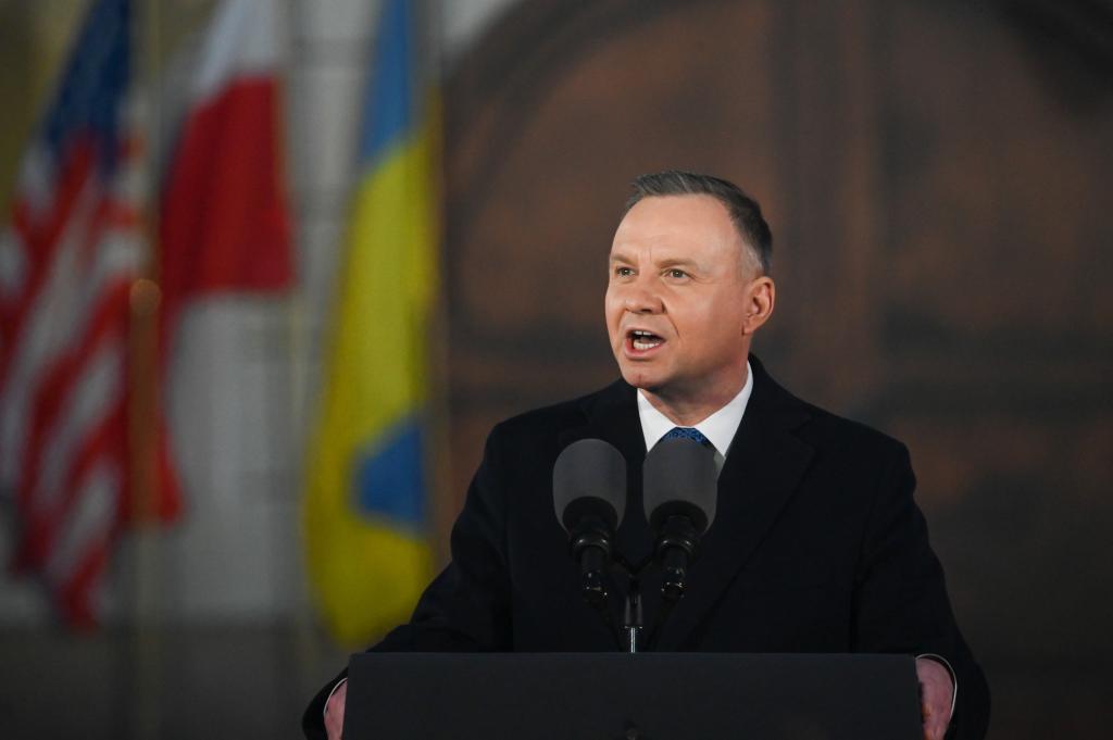 2023年2月21日,波蘭總統(tǒng)杜達(dá)在華沙發(fā)表講話(huà)。新華社發(fā)(阿列克西攝)