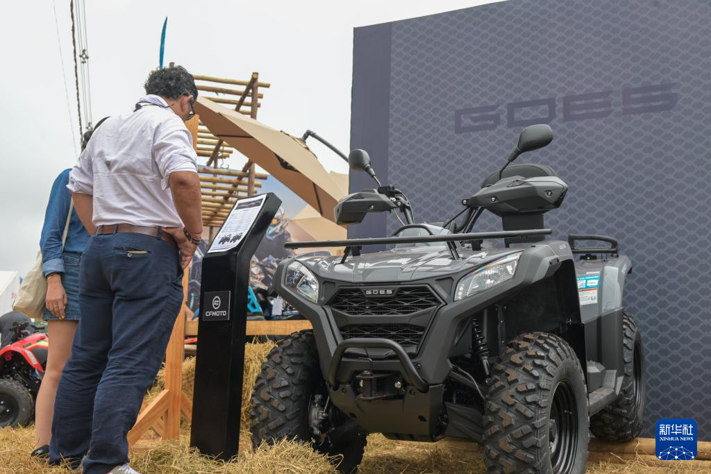 4月29日,在巴西圣保羅州里貝朗普雷圖市舉行的2025年巴西農(nóng)業(yè)科技展上,參觀者觀看春風(fēng)動力展示的全地形車。新華社記者 陳昊佺 攝