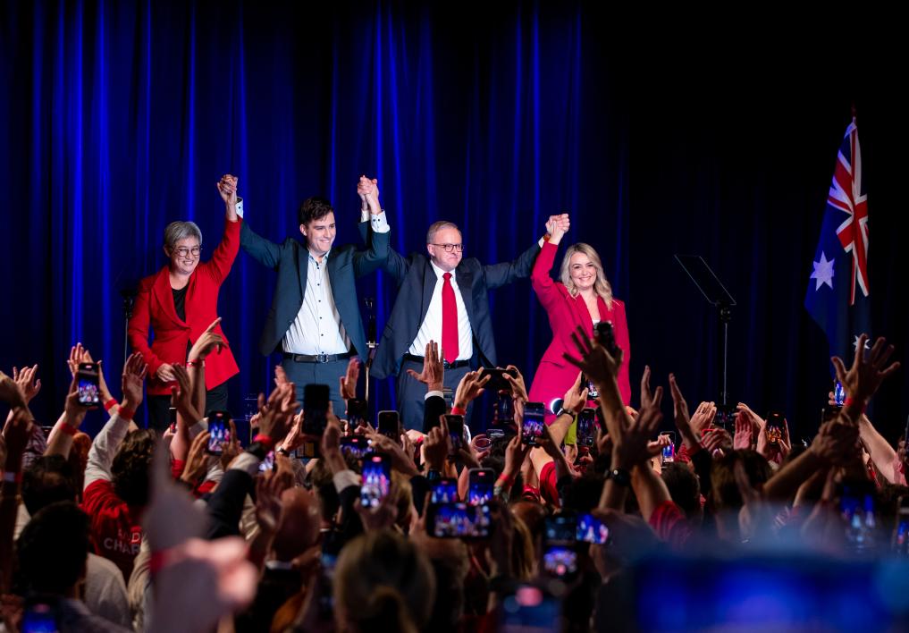 5月3日,在澳大利亞悉尼,澳大利亞總理阿爾巴尼斯(右二)與澳大利亞外長黃英賢(左一)在競選集會(huì)上慶祝勝利。新華社記者馬平攝