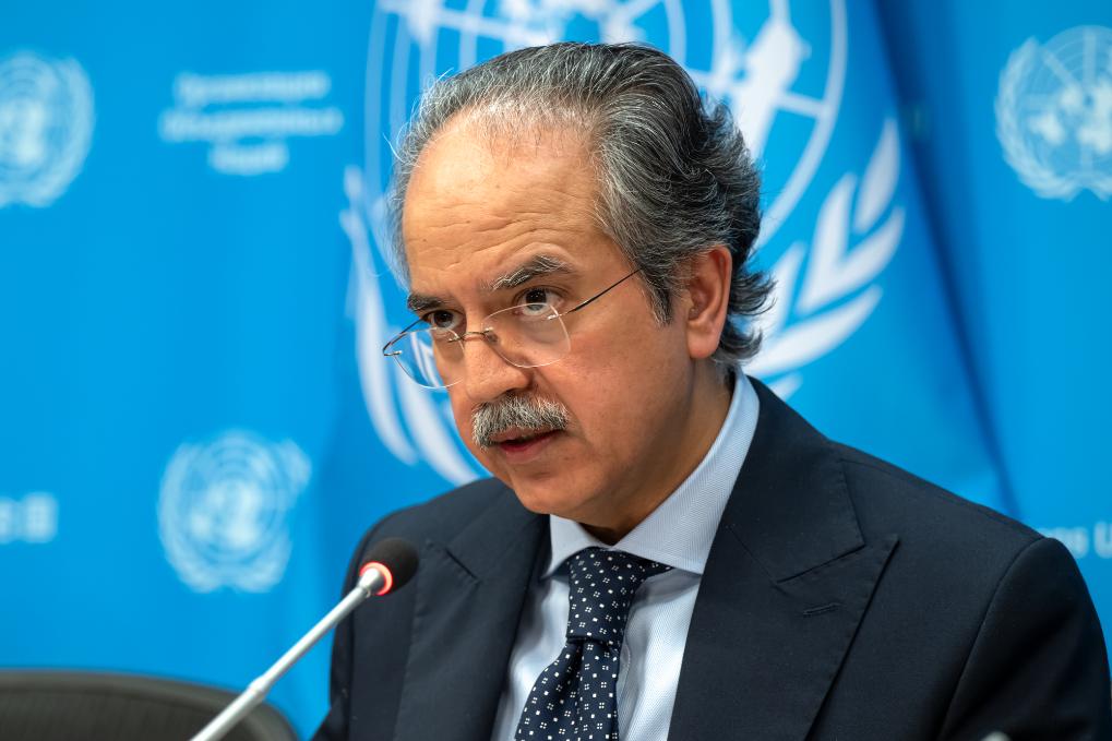5月2日,在位于紐約的聯(lián)合國(guó)總部,巴基斯坦常駐聯(lián)合國(guó)代表阿西姆·伊夫蒂哈爾·艾哈邁德在新聞發(fā)布會(huì)上講話。新華社發(fā)(聯(lián)合國(guó)供圖/馬克·加滕攝)