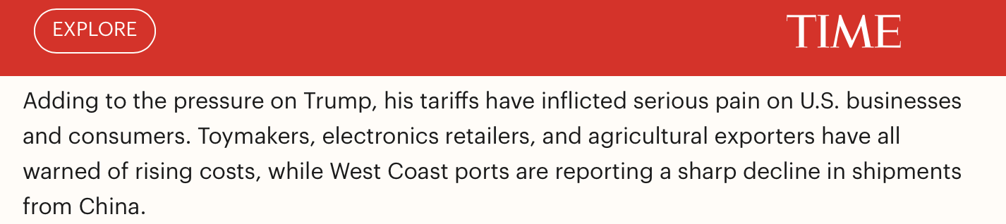 報(bào)道同時(shí)指出,美國(guó)政府的關(guān)稅措施給美國(guó)企業(yè)和消費(fèi)者帶來(lái)了沉重打擊,這進(jìn)一步加劇了美國(guó)政府的壓力。玩具制造商、電子產(chǎn)品零售商和農(nóng)產(chǎn)品出口商都警告稱(chēng),成本將上升,而美國(guó)西海岸的港口則報(bào)告稱(chēng),來(lái)自中國(guó)的貨運(yùn)量急劇下降。