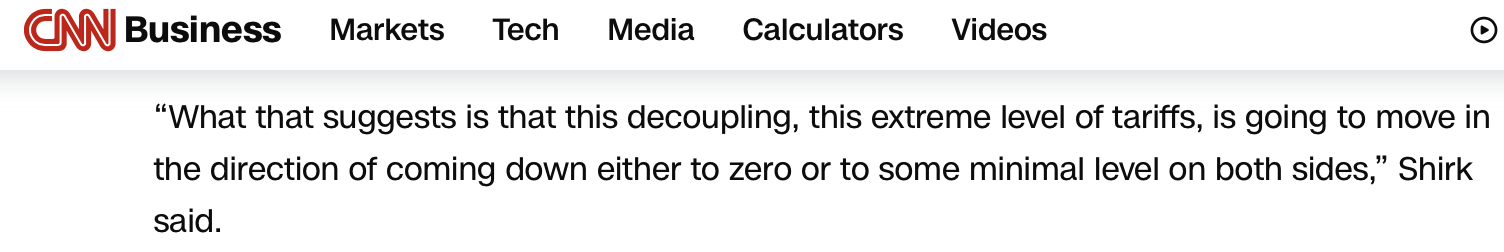美國(guó)有線(xiàn)電視新聞網(wǎng)的報(bào)道注意到美國(guó)財(cái)政部長(zhǎng)貝森特此前關(guān)于“本周末的談判將側(cè)重于緩和緊張局勢(shì)”的表態(tài)。報(bào)道援引加州大學(xué)圣迭戈分校全球政策與戰(zhàn)略學(xué)院研究教授、21世紀(jì)中國(guó)研究中心名譽(yù)主任蘇珊·希爾克的觀(guān)點(diǎn)指出,這表明美中之間“脫鉤、極端的關(guān)稅水平,將朝著降至零,或是降至最低水平的方向發(fā)展”。