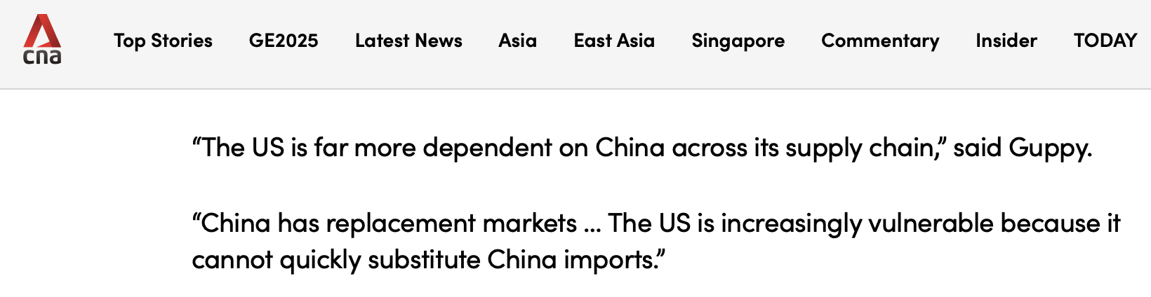 新加坡亞洲新聞臺(tái)的報(bào)道指出,中國(guó)在與美國(guó)的貿(mào)易談判中占據(jù)上風(fēng)。報(bào)道援引分析人士的觀(guān)點(diǎn)稱(chēng),中國(guó)已轉(zhuǎn)向減少對(duì)美國(guó)市場(chǎng)的依賴(lài),與全球南方國(guó)家建立更深層次的聯(lián)系,并通過(guò)共建“一帶一路”倡議投資基礎(chǔ)設(shè)施。