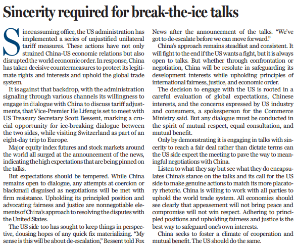 近期,美方不斷表示,希望同中方就關(guān)稅調(diào)整進行談判。當?shù)貢r間10日上午,中美經(jīng)貿(mào)高層會談在瑞士日內(nèi)瓦開始舉行。中共中央政治局委員、國務(wù)院副總理何立峰作為中美經(jīng)貿(mào)中方牽頭人,當天與美方牽頭人、美國財長貝森特舉行會談。中美關(guān)稅戰(zhàn)迎來破冰契機。