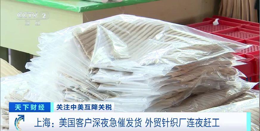 在中美大幅互降關(guān)稅后,位于上海松江區(qū)李塔匯鎮(zhèn)的一家針織廠,接到了美國(guó)客戶可以出貨的通知。已經(jīng)在包裝車間里堆了1個(gè)月的50000多件成衣,終于可以開(kāi)啟最后的工序,車間內(nèi)的工人全員上崗,縫商標(biāo)、熨燙、打吊牌,各個(gè)工序有條不紊。