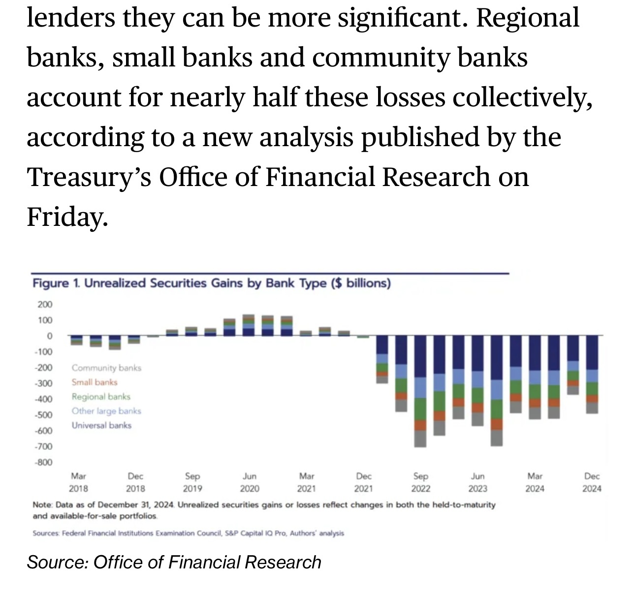 文章回憶道,2022年和2023年,美國國債和抵押貸款債券的“未實現(xiàn)損失”成為貸款機構的一大擔憂,當時利率大幅上升,引發(fā)了以硅谷銀行為首的幾家銀行倒閉?!拔磳崿F(xiàn)損失”,是指在某個資產(chǎn)或證券的市場價值低于其購入價格的情況下,尚未出售或平倉的投資組合中的損失。
