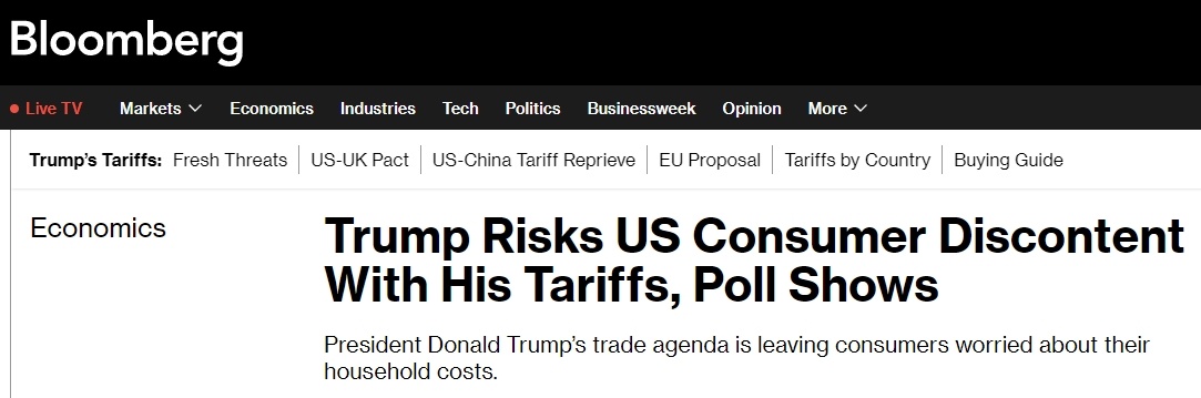 彭博社近日民調(diào)顯示,56%的受訪美國人認(rèn)為,特朗普對其他國家征收的關(guān)稅對他們的家庭財務(wù)狀況產(chǎn)生了不良影響。即使特朗普政府一直在鼓吹加關(guān)稅能讓產(chǎn)業(yè)回流美國并增加財政收入,約52%的受訪者還是表示,美政府承諾的好處不值得他們?yōu)榇烁冻龅慕?jīng)濟(jì)代價。