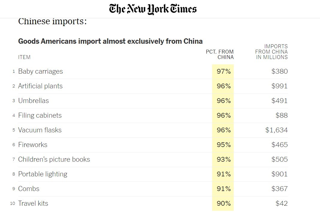 文章說,根據(jù)美國國際貿(mào)易委員會2024年發(fā)布的數(shù)據(jù),中國是美國多個商品品類的唯一或主要進(jìn)口來源國。具體來看:幾乎完全從中國進(jìn)口的品類包括嬰兒車、仿真植物、雨傘、煙花、兒童繪本等,進(jìn)口金額最高的品類主要有電話、計算機(jī)、汽車及零部件、視頻顯示器、電熱器、玩具等;進(jìn)口數(shù)量最大的品類主要是各類塑料制品,包括塑料日用品和工業(yè)用塑料件等。