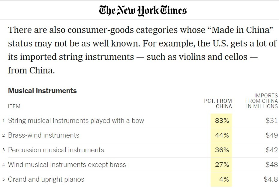 文章說,從清單中可以看出,美國從中國進(jìn)口的主要商品都是消費(fèi)品,覆蓋生活中的多個場景:你衣櫥中的領(lǐng)帶、手套和連褲襪幾乎都是從中國進(jìn)口的;如果你是一名運(yùn)動員,尤其是球類運(yùn)動的運(yùn)動員,那么你用的羽毛球、乒乓球、網(wǎng)球、健身房設(shè)備、泳池設(shè)備等都非常依賴“中國制造”;還有一些消費(fèi)品類別的“中國制造”可能不那么廣為人知。例如,美國從中國進(jìn)口了大量弦樂器,包括小提琴和大提琴。維生素及其衍生物也大量從中國進(jìn)口,還有各種冷凍魚類,包括鰻魚、鱈魚、羅非魚等等。