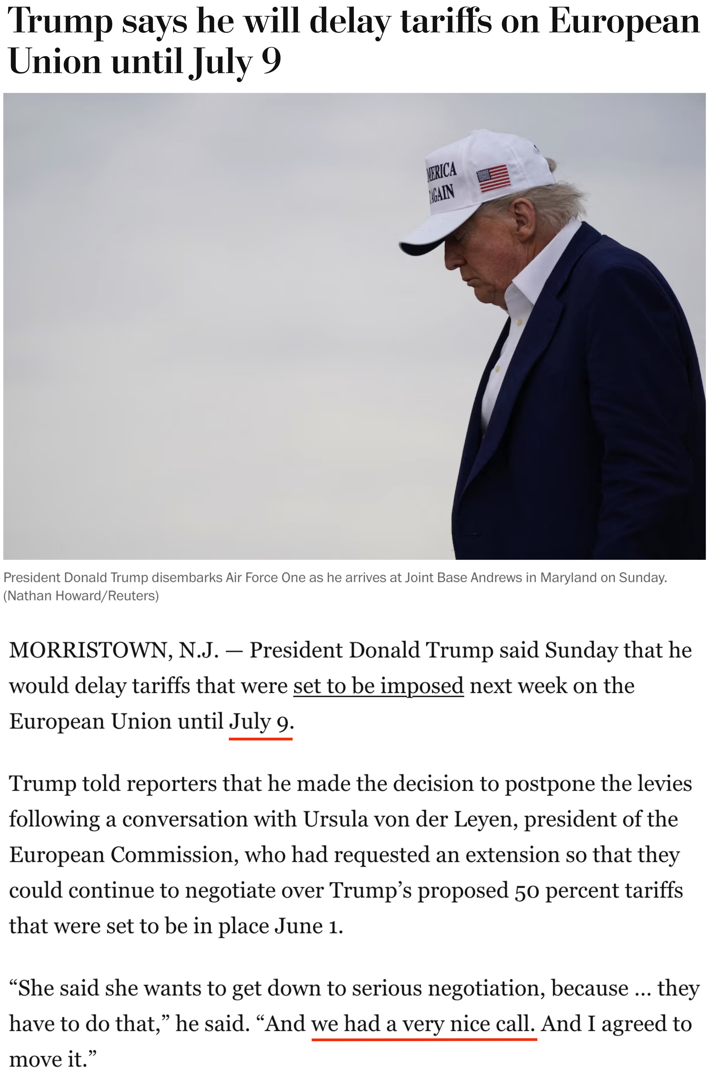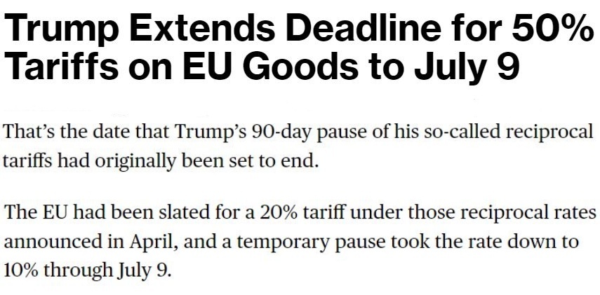 他25日告訴記者,自己當(dāng)天與歐盟委員會(huì)主席馮德萊恩“愉快”地通了電話,并應(yīng)對(duì)方要求,決定將原計(jì)劃從6月1日開始對(duì)歐盟加征的50%的關(guān)稅推遲到7月9日,以便雙方有時(shí)間就此進(jìn)行談判。