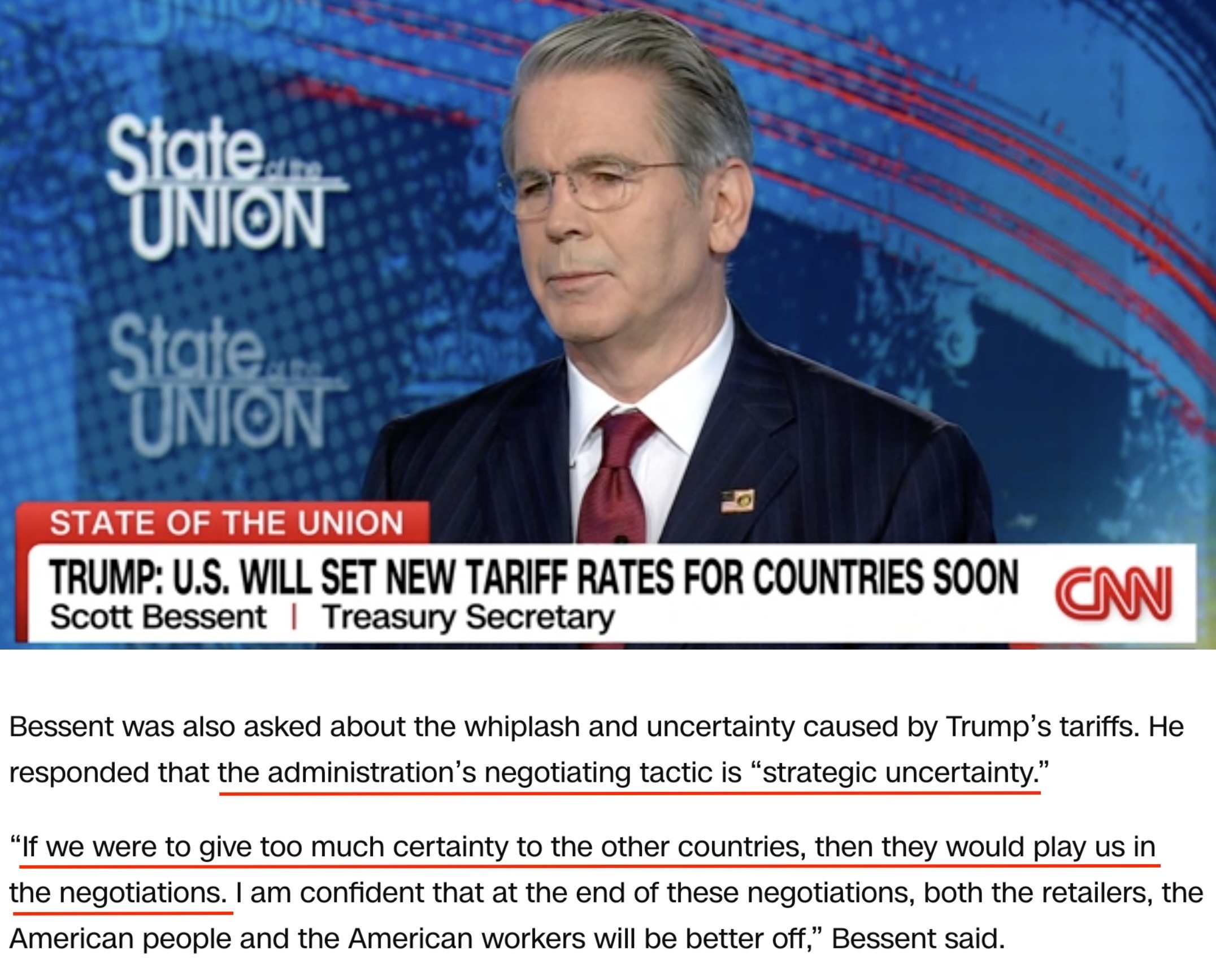 說到美國關(guān)稅的不確定性,美國財(cái)長貝森特近日接受采訪時(shí)曾有過一番“高論”。據(jù)他稱,在美國與貿(mào)易伙伴展開關(guān)稅談判之際,美國政府表現(xiàn)出的“戰(zhàn)略不確定性”是一種談判策略,而非缺點(diǎn)。