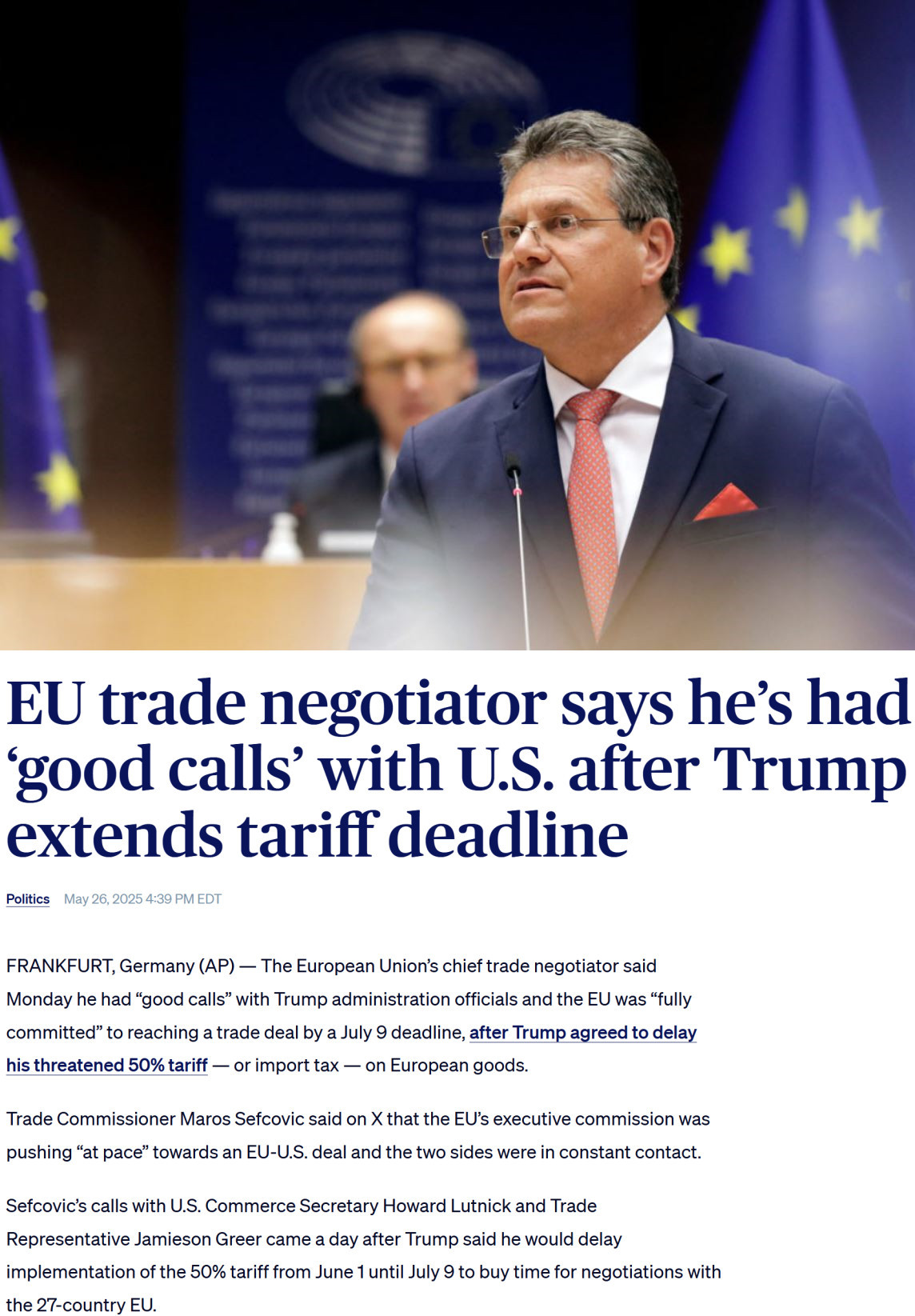 當(dāng)?shù)貢r(shí)間26日,歐盟貿(mào)易委員謝夫喬維奇與美方代表通話后表示,歐盟完全致力于在7月9日前與美方達(dá)成一項(xiàng)協(xié)議。