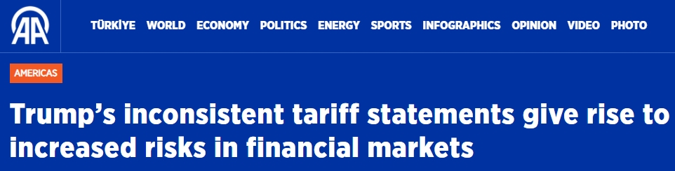 土耳其阿納多盧通訊社(Anadolu Ajans )27日的報道指出,美國政府在關(guān)稅問題上前后不一的言論和難以預(yù)測的行動,導(dǎo)致全球金融市場風(fēng)險加大、波動加劇,包括最近針對歐盟所作的決定。