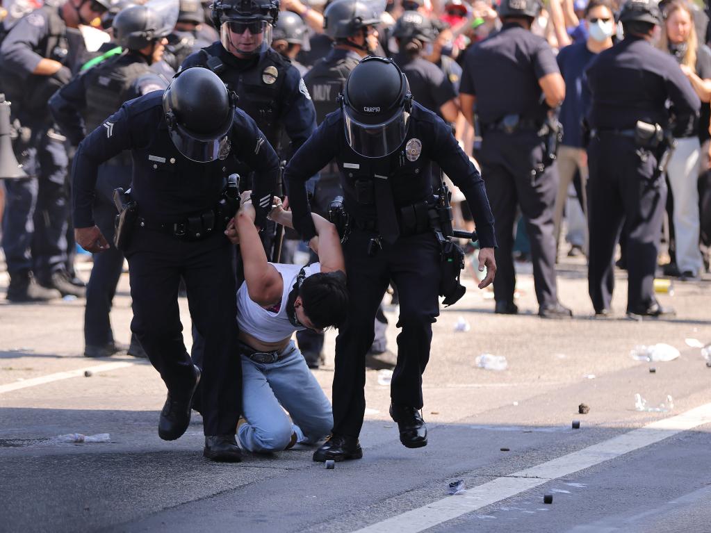 6月8日,在美國加利福尼亞州洛杉磯市中心的聯(lián)邦執(zhí)法機構門前,一名抗議者被警察控制。新華社發(fā)(邱晨攝)