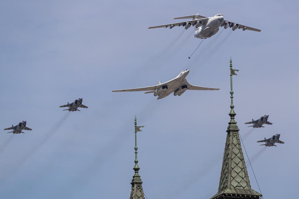 2022年5月7日,在俄羅斯首都莫斯科,米格-31戰(zhàn)機(jī)、圖-160戰(zhàn)略轟炸機(jī)、伊爾-78空中加油機(jī)(從后至前)編隊(duì)飛過紅場(chǎng)上空。新華社記者白雪騏攝