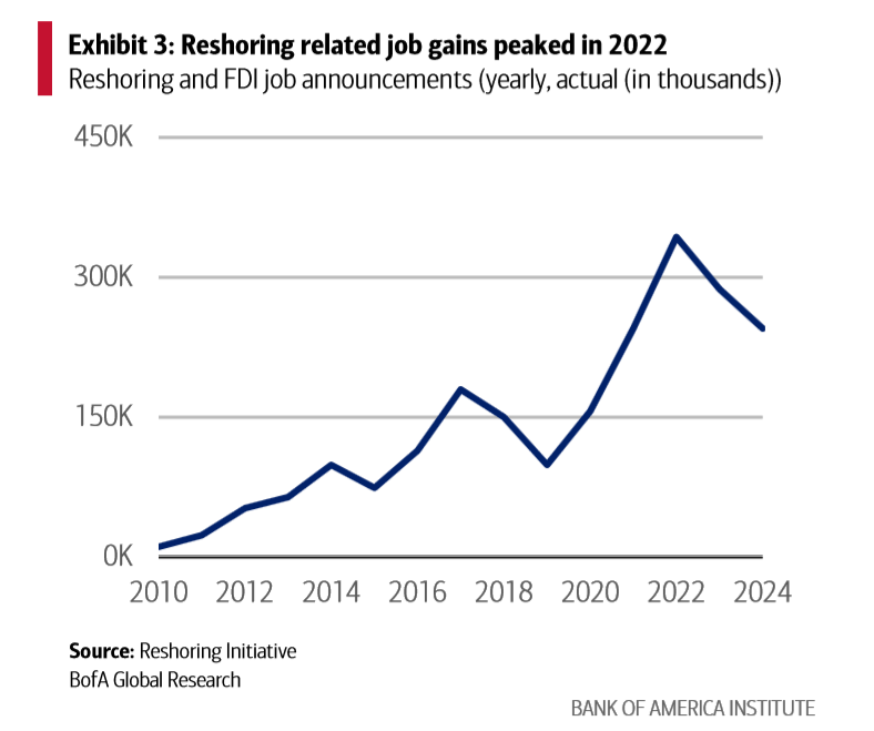 報告顯示,美國制造業(yè)回流創(chuàng)造的就業(yè)機會在2022年達到高峰后開始減少。