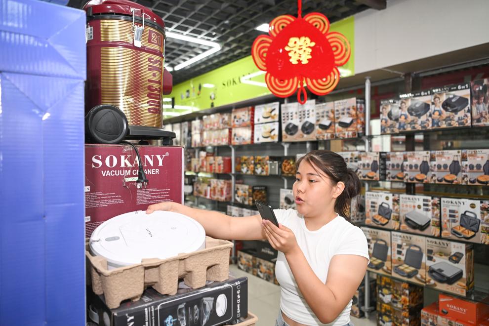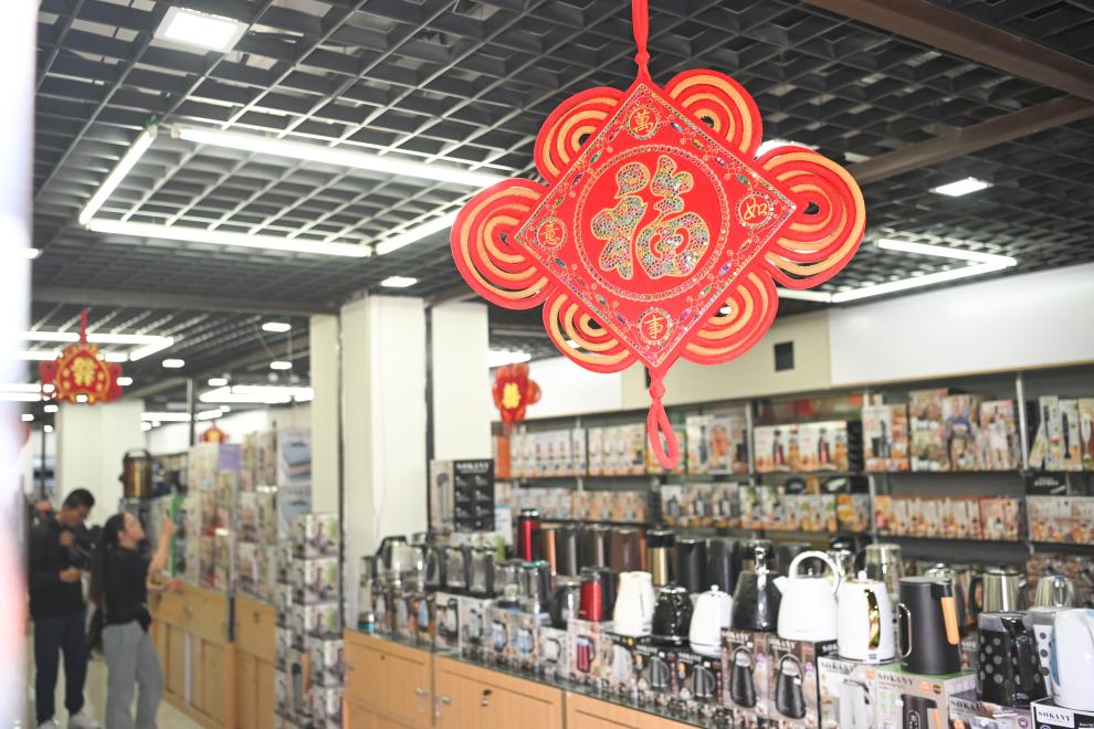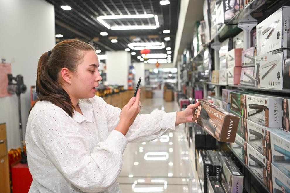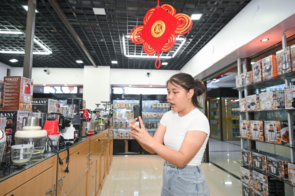 哈薩克斯坦青年學(xué)生在合作中心的商城內(nèi)跨境直播。