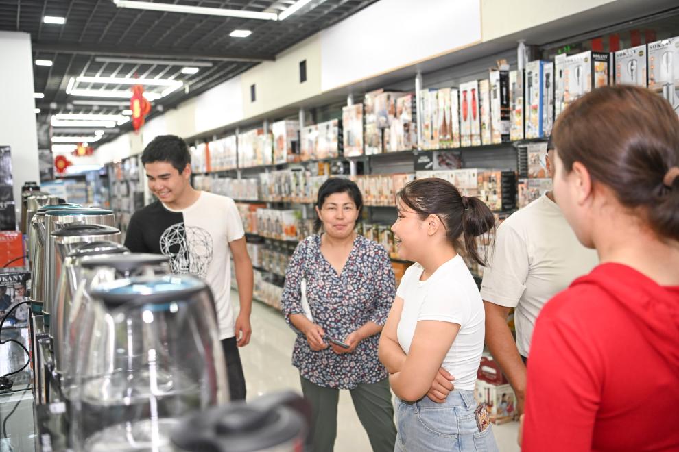 前來合作中心購物的哈薩克斯坦顧客和巴爾然在一起聊天。