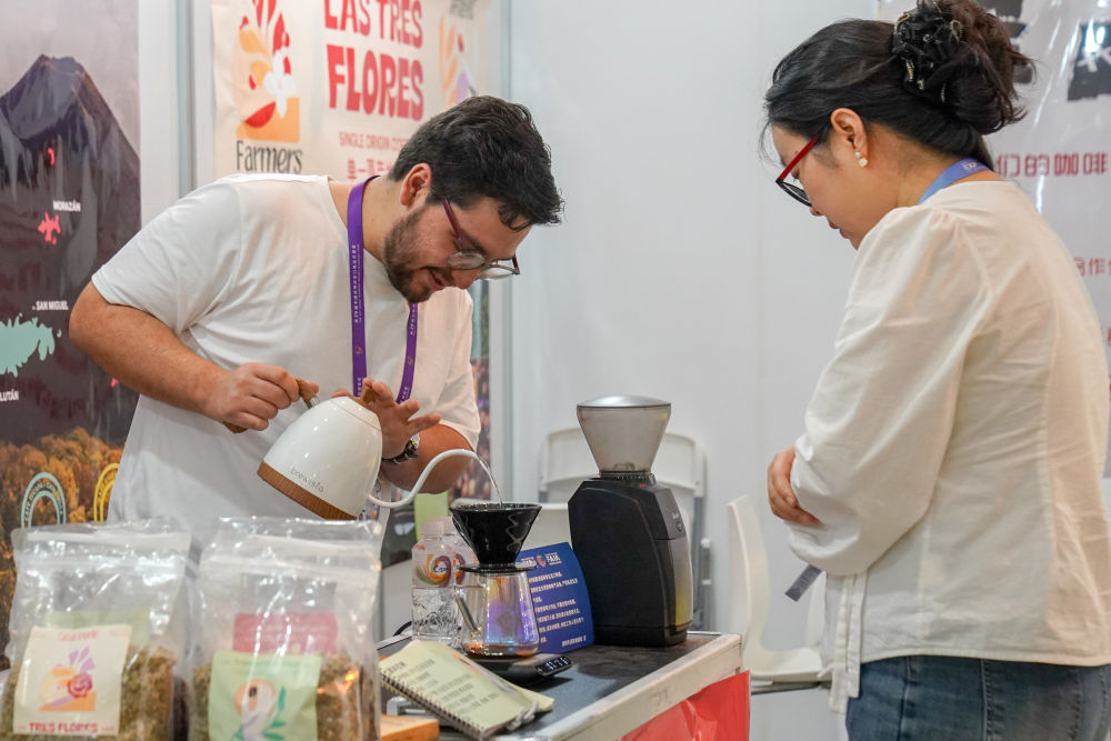 6月20日,來自薩爾瓦多的參展商(左)在咖啡產(chǎn)業(yè)館為顧客沖咖啡。 新華社發(fā)(彭奕凱 攝)