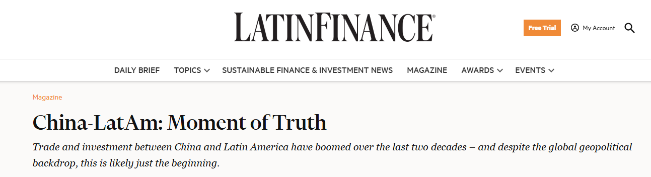 長(zhǎng)期關(guān)注拉美及加勒比地區(qū)發(fā)展的《拉美金融》雜志最近的一篇文章,聚焦了過去二十年拉丁美洲與中國(guó)之間貿(mào)易和投資的蓬勃發(fā)展。文章指出,盡管當(dāng)前全球地緣政治形勢(shì)復(fù)雜,但拉美與中國(guó)這種良好的發(fā)展勢(shì)頭可能僅僅是雙方合作的開端。