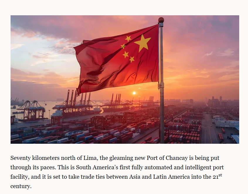 文章首先將目光投向在秘魯首都利馬以北70公里處的錢凱港。這個(gè)由中國(guó)和秘魯合作建設(shè)的嶄新港口,是南美洲首個(gè)全自動(dòng)智能化港口設(shè)施,它將把亞洲與拉丁美洲的貿(mào)易關(guān)系帶入21世紀(jì)。隨著通往該港口的跨大陸公路和鐵路連接完工,錢凱港不僅要處理涉及南美洲太平洋沿岸的進(jìn)出口貨物,也將處理從阿根廷、巴西和巴拉圭穿越太平洋運(yùn)往中國(guó)的牛肉、大豆和小麥等貨物。