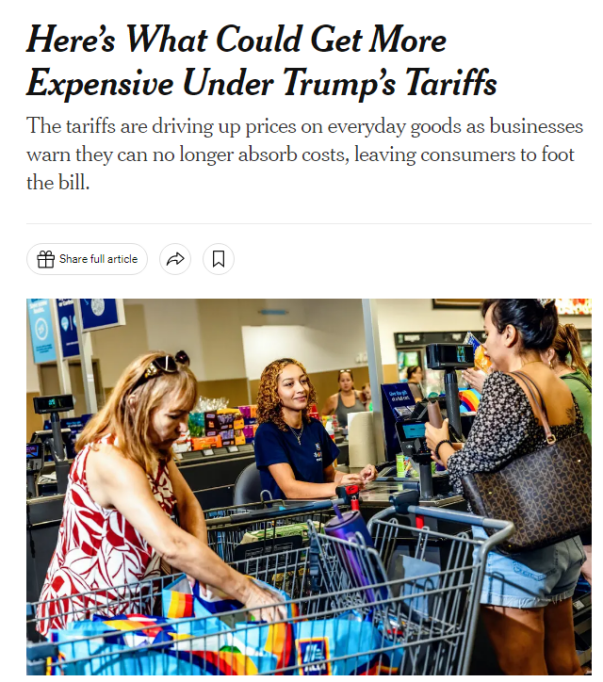 美國(guó)政府此前公布的經(jīng)過(guò)調(diào)整的“對(duì)等關(guān)稅”已經(jīng)生效,美數(shù)十個(gè)貿(mào)易伙伴將被征收10%至41%不等的關(guān)稅,隨之而來(lái)的便是被關(guān)稅推高的物價(jià)。美國(guó)《紐約時(shí)報(bào)》刊文稱,美國(guó)消費(fèi)者或許很快就會(huì)發(fā)現(xiàn),大到汽車(chē),小到一雙鞋和一根香蕉,幾乎所有商品的售價(jià)都會(huì)上漲。