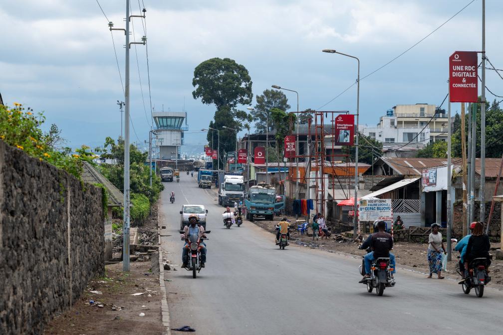 這是5月5日在剛果(金)東部北基伍省戈馬市拍攝的市中心街道和遠(yuǎn)處的機(jī)場(chǎng)塔臺(tái)。新華社記者鄭揚(yáng)子攝