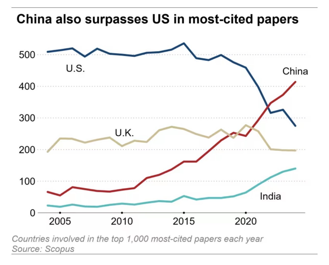 文章表示,中國氣候變化研究論文在其他文獻(xiàn)中的引用次數(shù)也在顯著增加——這是研究質(zhì)量的一個(gè)重要標(biāo)志。從2004年到2024年,每年被引用次數(shù)最多的1000篇論文中,中國在2022年超越美國,占據(jù)了領(lǐng)先地位。