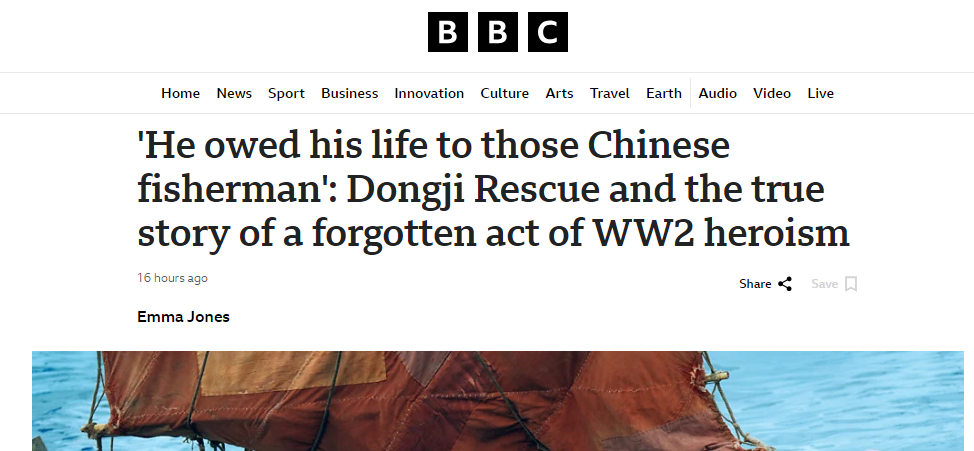 暑期檔電影《東極島》正在熱映,影片講述了1942年,一艘搭載英軍戰(zhàn)俘的船只在舟山群島附近被潛艇擊沉,上千名戰(zhàn)俘被封鎖在船艙內(nèi),命懸一線。危難之際,東極島上的漁民,不顧風(fēng)高浪急與生命危險(xiǎn),毅然駛向深海救人的故事。近日,英國(guó)廣播公司網(wǎng)站發(fā)表一篇文章回顧了相關(guān)歷史事件,標(biāo)題是《“他的生命歸功于中國(guó)漁民”:東極島救援與二戰(zhàn)中一段被塵封的英雄事跡》。