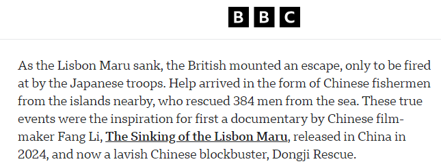 文章說,在這艘載有英軍戰(zhàn)俘的船只“里斯本丸”號(hào)沉沒過程中,英國(guó)戰(zhàn)俘組織突圍逃生,卻遭到日軍掃射。附近島嶼的中國(guó)漁民們伸出了援手,從海中救起384人。這一真實(shí)事件先后催生了兩部影視作品:紀(jì)錄片《里斯本丸沉沒》,以及電影《東極島》。