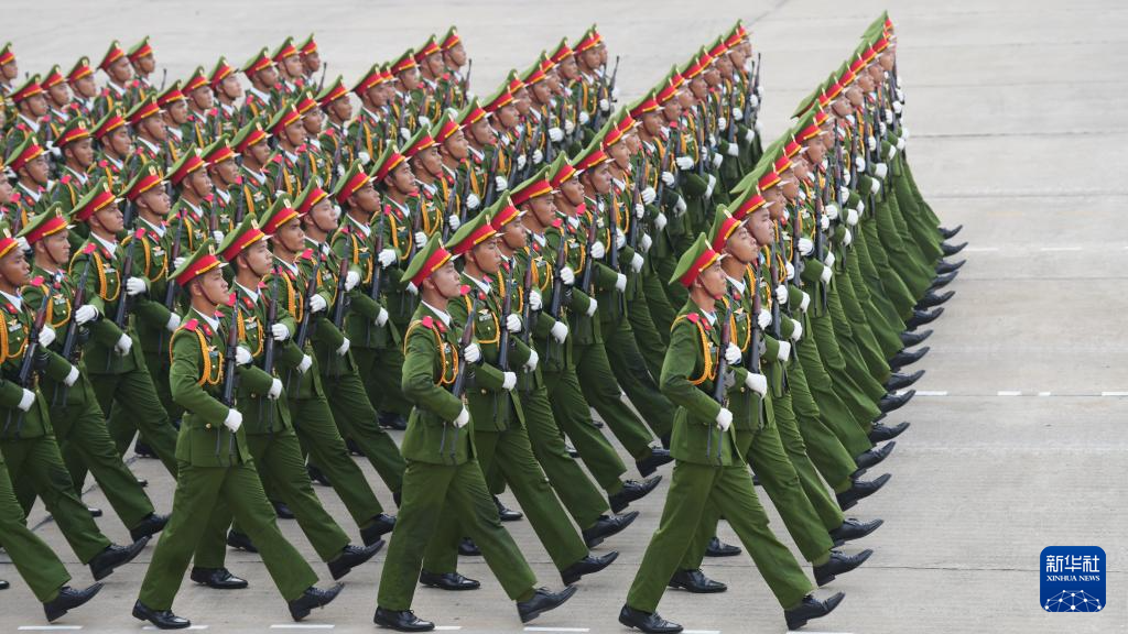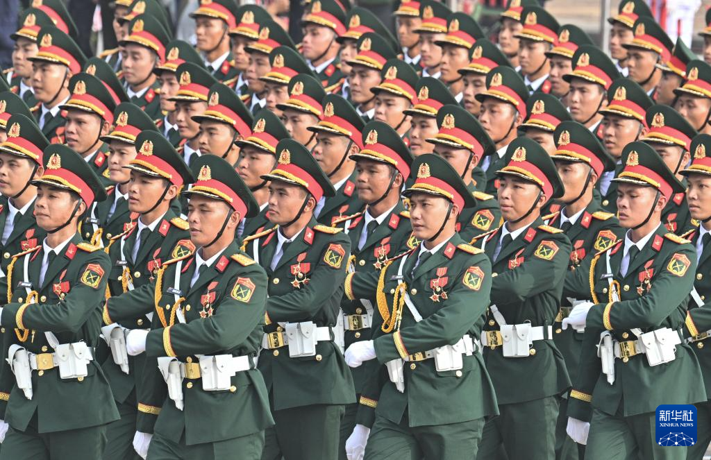 9月2日,在越南河內(nèi)巴亭廣場,越南軍隊方陣走向主席臺接受檢閱。新華社記者 胡佳麗 攝