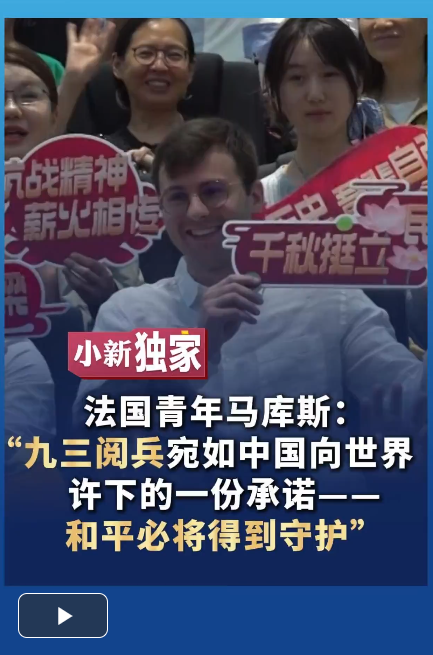 9月3日,法國青年馬庫斯在北京一家電影院通過4K超高清大熒幕觀看了紀念中國人民抗日戰(zhàn)爭暨世界反法西斯戰(zhàn)爭勝利80周年大會的電視直播。直播結(jié)束后,馬庫斯在接受中新社記者采訪時表示,整個閱兵活動給他留下了極為深刻的印象,它宛如一份向世界許下的承諾——和平必將得到守護。(謝龍飛 何凌霄 視頻制作 田敏娜)