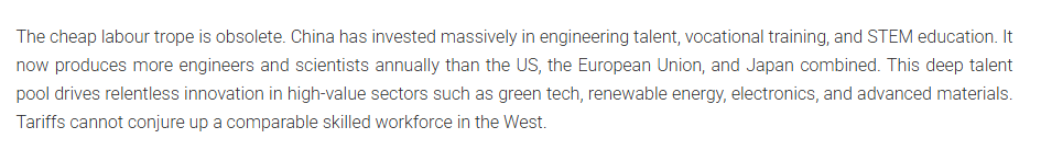 中國在工程人才、職業(yè)培訓(xùn)以及科學(xué)、技術(shù)、工程和數(shù)學(xué)教育等方面投入了大量資金?,F(xiàn)在,它每年培養(yǎng)的工程師和科學(xué)家比美國、歐盟和日本的總和還要多。這種深厚的人才庫推動了綠色技術(shù)、可再生能源、電子和先進材料等高價值領(lǐng)域的不懈創(chuàng)新。