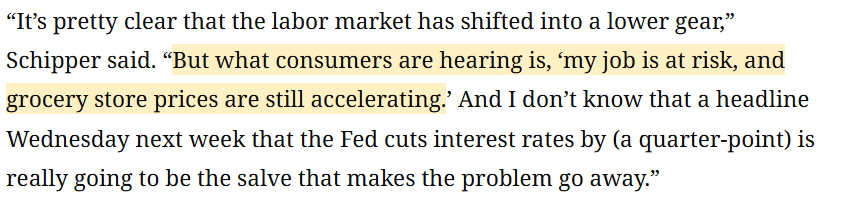 美國圣托馬斯大學(xué)副教授泰勒·施普爾 (Tyler Schipper)認(rèn)為 :對普通消費(fèi)者來說,耳邊最真切的聲音是“我的工作隨時(shí)可能保不住”,是“超市里的食品雜貨價(jià)格還在一個(gè)勁往上漲”。所以我實(shí)在不確定,下周“美聯(lián)儲降息”的頭條新聞,真能成為化解這些現(xiàn)實(shí)困境的良藥嗎?