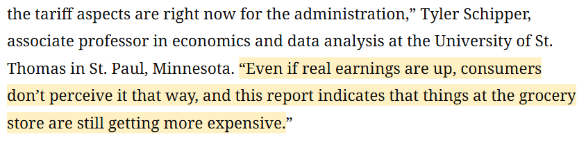 經(jīng)濟(jì)學(xué)家泰勒 施皮珀(Tyler Schipper)直言:“老百姓感受不到工資上漲,他們只知道超市商品的價(jià)格越來越貴?!?/p>