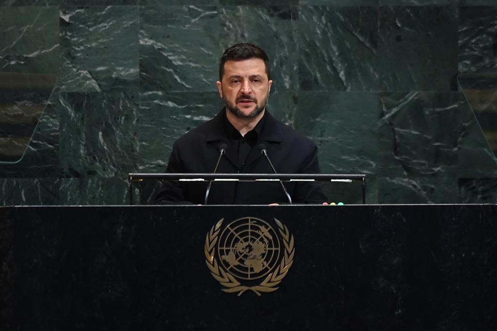 9月24日,在位于紐約的聯(lián)合國總部,烏克蘭總統(tǒng)澤連斯基在第80屆聯(lián)合國大會一般性辯論上發(fā)言。新華社記者李睿攝