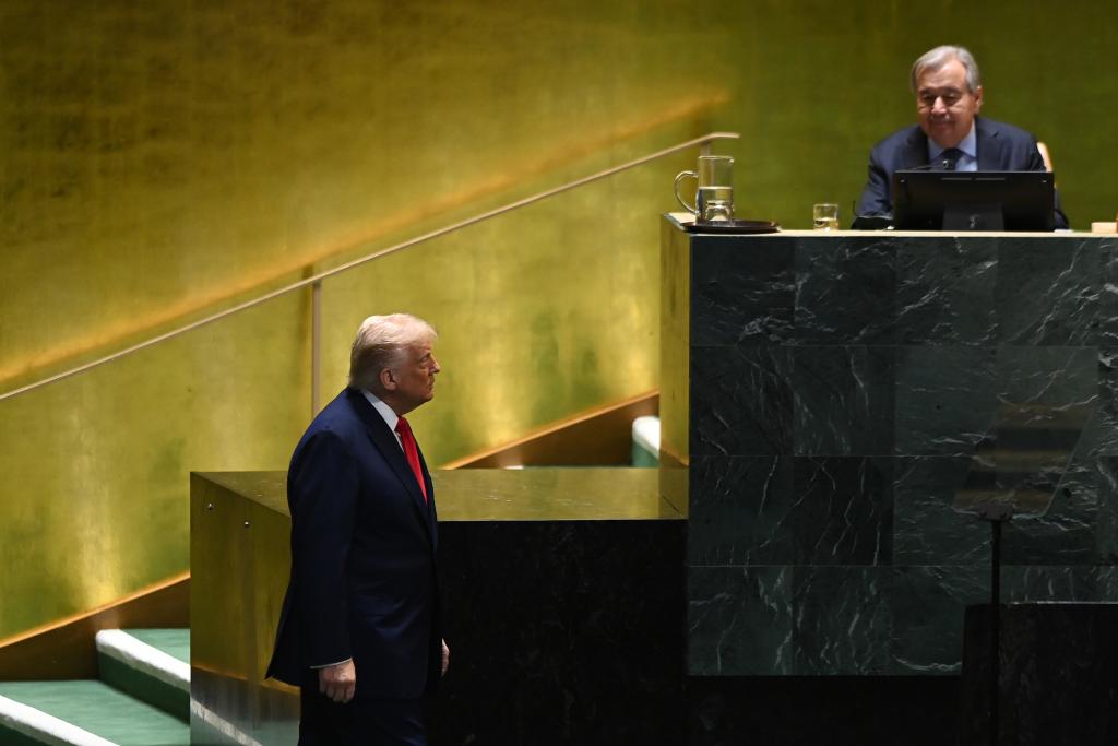 9月23日,在位于紐約的聯(lián)合國總部,美國總統(tǒng)特朗普(左)在第80屆聯(lián)合國大會一般性辯論上準備登臺發(fā)言。新華社記者李睿攝