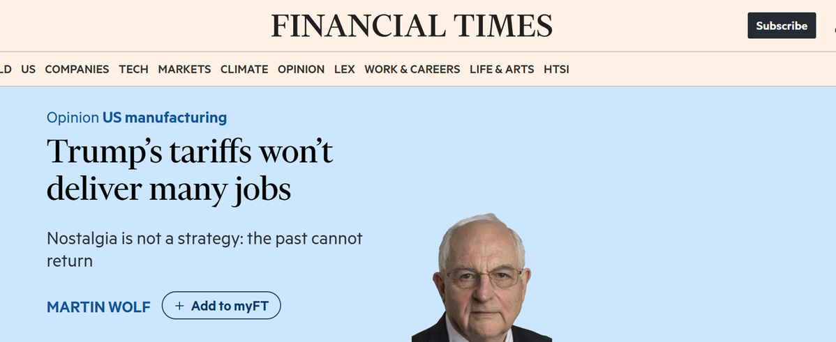 英國《金融時報》副總編及首席經(jīng)濟評論員馬丁·沃爾夫(Martin Wolf)8日發(fā)表評論文章稱,事實表明,特朗普政府推行的貿(mào)易保護主義政策,并未兌現(xiàn)其對選民所作的核心承諾——為美國創(chuàng)造大量制造業(yè)就業(yè)崗位,尤其是面向那些曾經(jīng)依賴傳統(tǒng)工業(yè)、如今卻面臨地區(qū)經(jīng)濟衰落困境的工人群體。他進一步指出,這一承諾本質(zhì)上是空洞的,其政策實質(zhì)是為政府自身及其背后的富豪階層牟取利益。