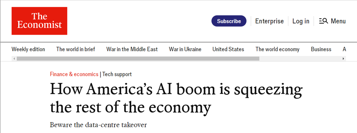 英國(guó)《經(jīng)濟(jì)學(xué)人》雜志近期評(píng)論指出,除了人工智能之外,美國(guó)經(jīng)濟(jì)的大部分領(lǐng)域似乎都顯得低迷。AI爆發(fā)式增長(zhǎng)雖能“美化”數(shù)字,卻忽略了美國(guó)實(shí)體經(jīng)濟(jì)的空心化,導(dǎo)致GDP含金量低。