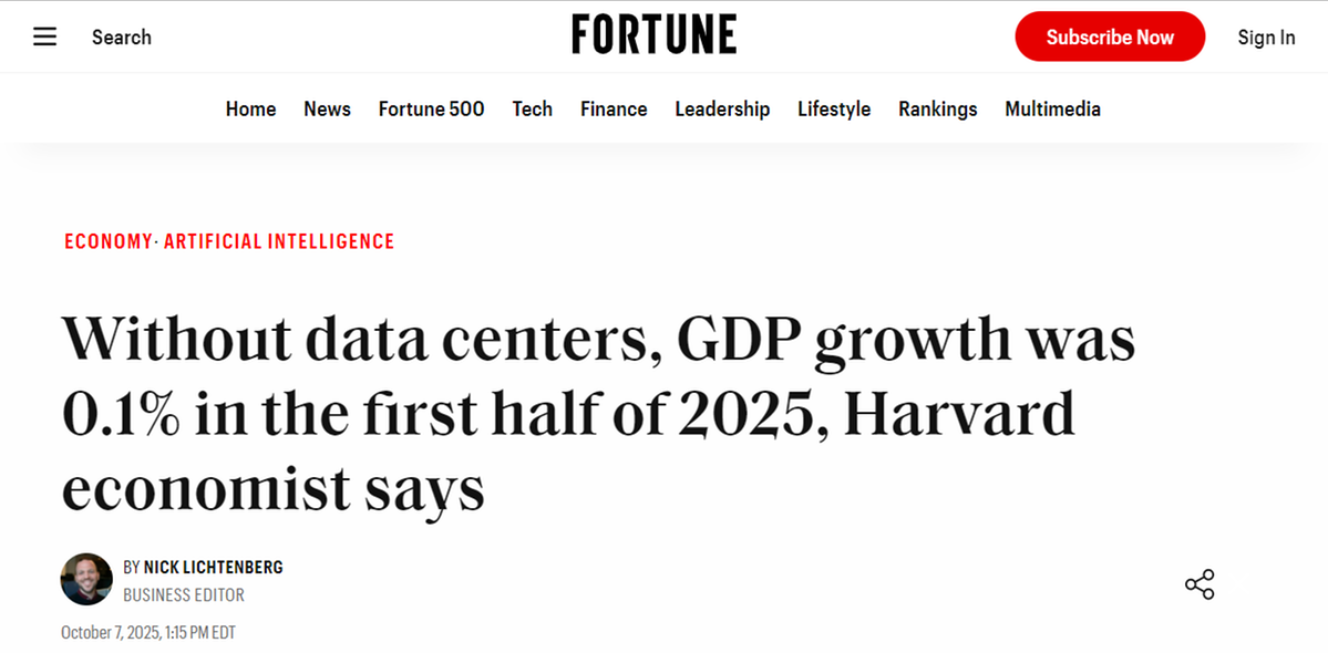 2025年上半年,美國(guó)GDP增長(zhǎng)幾乎全部依賴數(shù)據(jù)中心和AI投資,其中AI投資占比近92%。哈佛大學(xué)經(jīng)濟(jì)學(xué)家杰森·弗曼指出,若剔除這一領(lǐng)域,其余產(chǎn)業(yè)合計(jì)成長(zhǎng)率僅0.1%,幾乎陷入停滯。