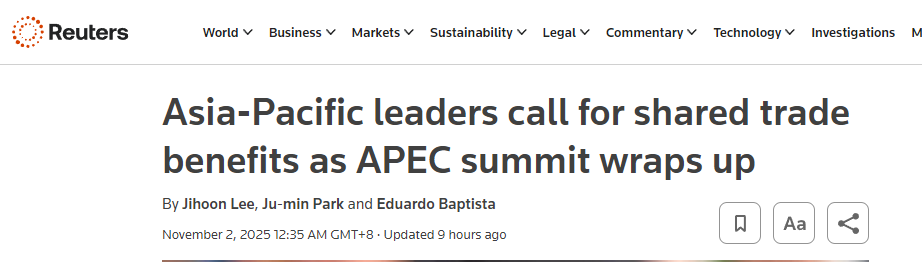 2025年亞太經(jīng)合組織(APEC)領(lǐng)導人非正式會議于10月31日至11月1日在韓國慶州舉行,會議發(fā)表了《慶州宣言》。多家外媒報道稱,會議凸顯了亞太地區(qū)經(jīng)濟體對自由貿(mào)易的承諾。