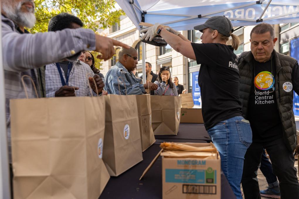 11月5日,在美國首都華盛頓,聯(lián)邦雇員排隊(duì)領(lǐng)取免費(fèi)食物。新華社記者胡友松攝